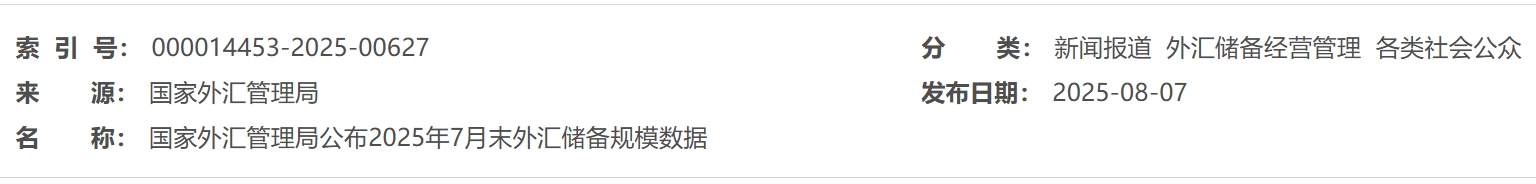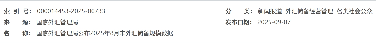 国家外汇管理局公布2025年8月末外汇储备规模数据