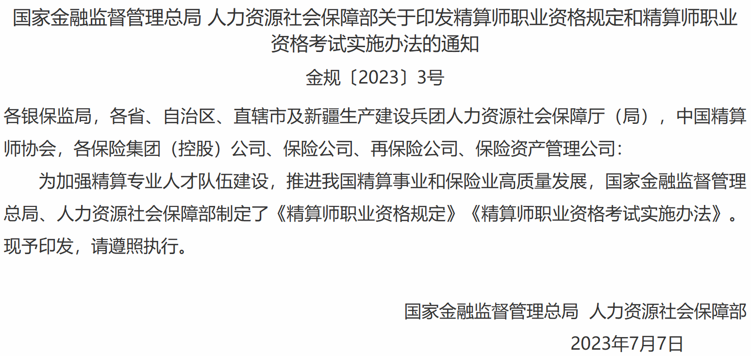 国家金融监督管理总局 人力资源社会保障部发布《精算师职业资格规定..