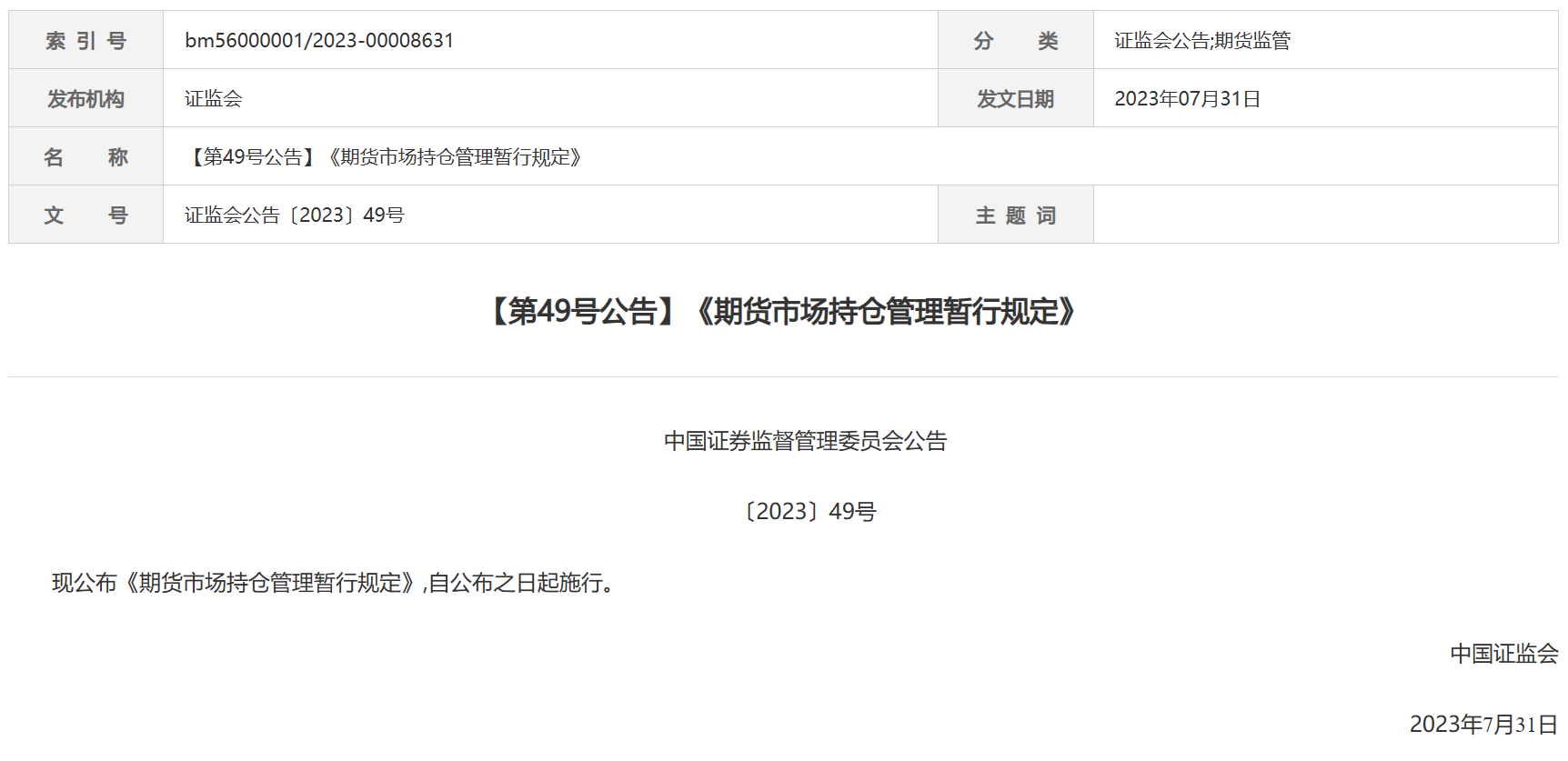 证监会发布《期货市场持仓管理暂行规定》