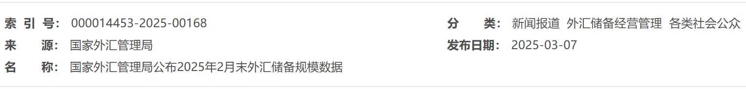 国家外汇管理局公布2025年2月末外汇储备规模数据