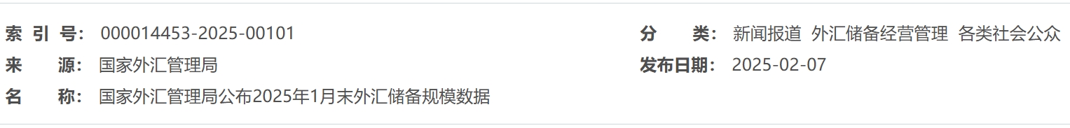 国家外汇管理局公布2025年1月末外汇储备规模数据