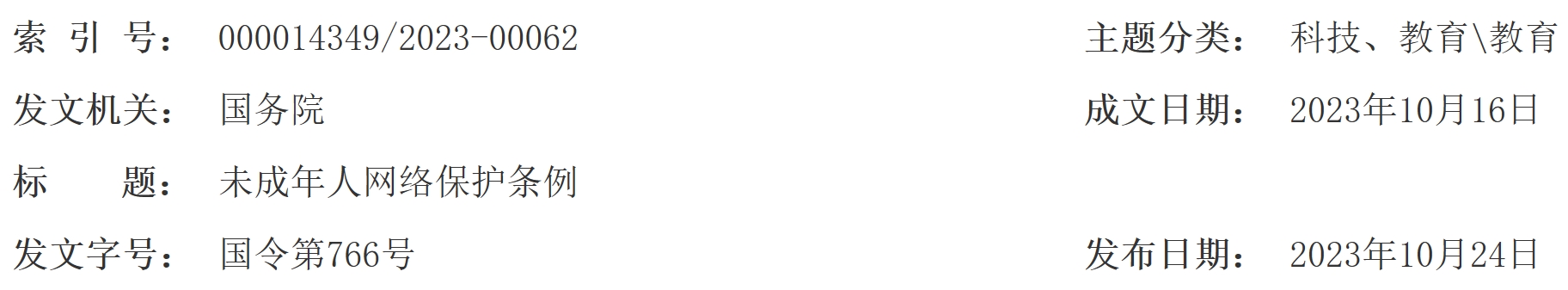 《未成年人网络保护条例》已经2023年9月20日国务院第15次常务会议通过,现予公布,自2024年1月1日起施行。