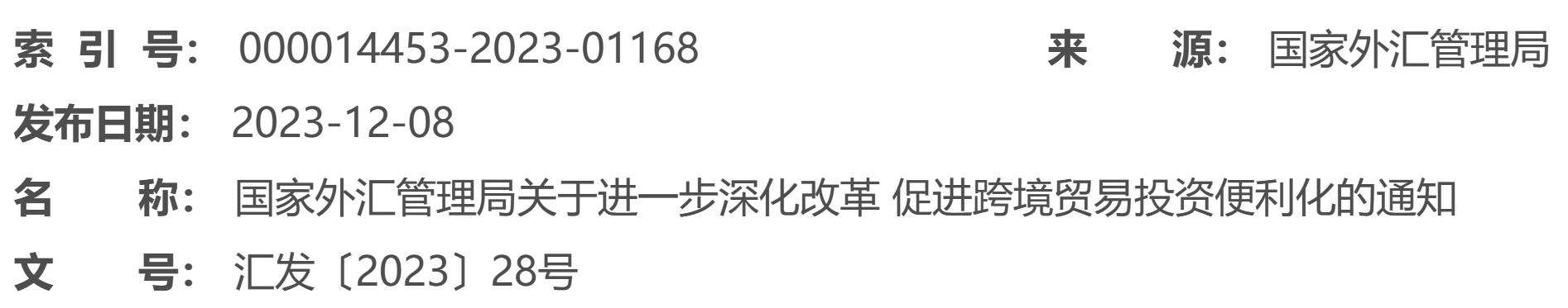 为深入贯彻落实党中央、国务院决策部署,进一步促进跨境贸易投资便利化,切实提升外汇管理服务实体经济能力,国家外汇管理局决定进一步深化外汇管理改革,便利市场主体合规办理跨境贸易投资业务,以高水平开放促进高质量发展。现就有关事项通知如下: