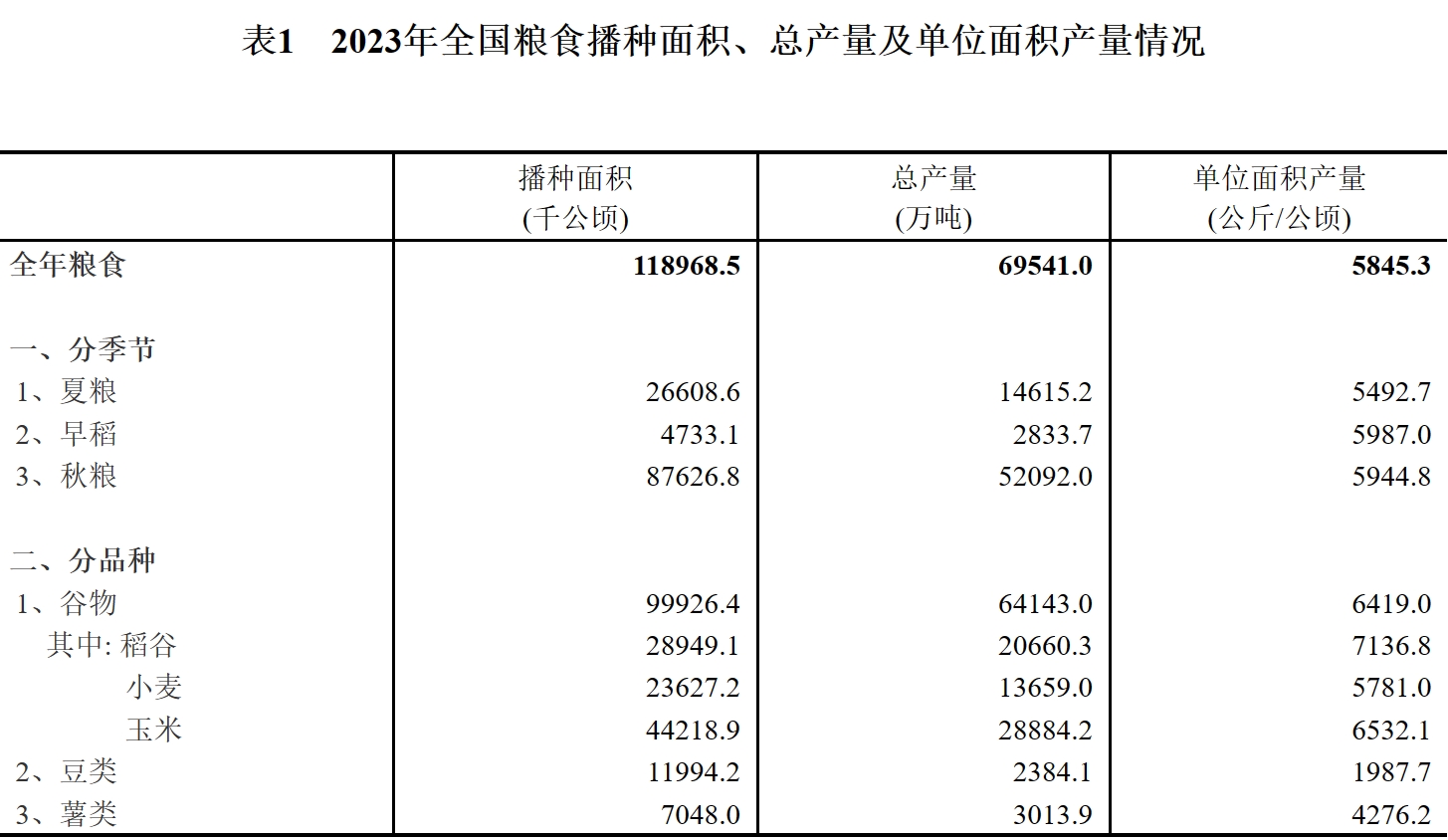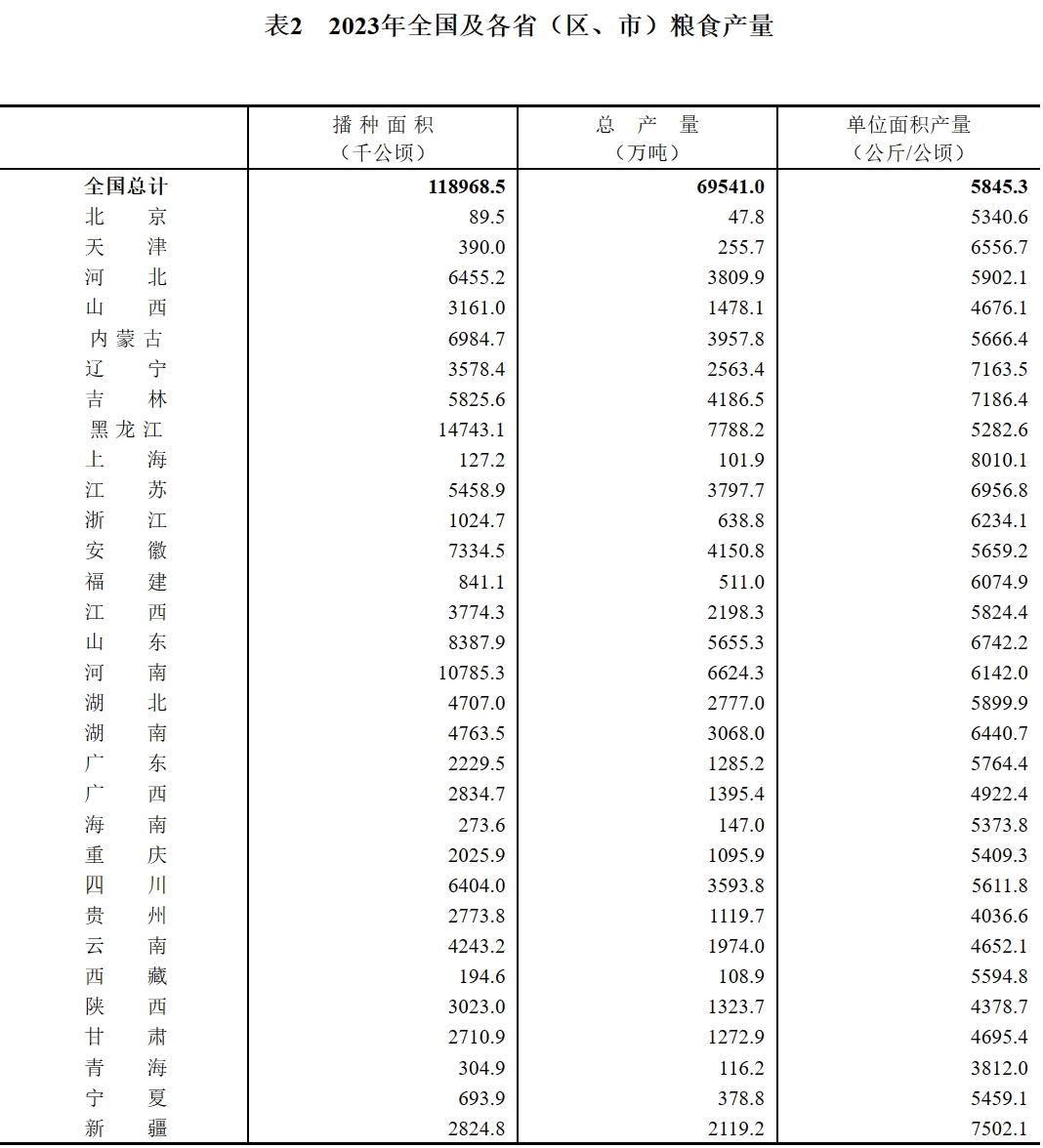 根据对全国31个省(区、市)的调查,2023年全国粮食播种面积、单位面积产量和总产量分别如下: