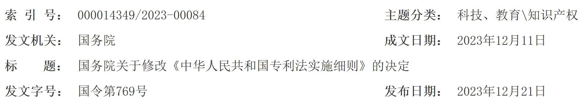 现公布《国务院关于修改〈中华人民共和国专利法实施细则〉的决定》,自2024年1月20日起施行。