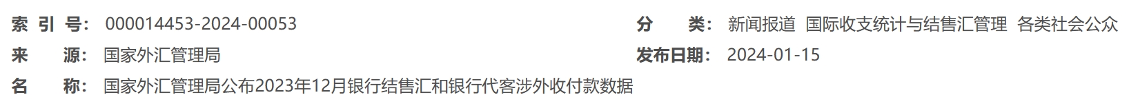 国家外汇管理局公布2023年12月银行结售汇和银行代客涉外收付款数据