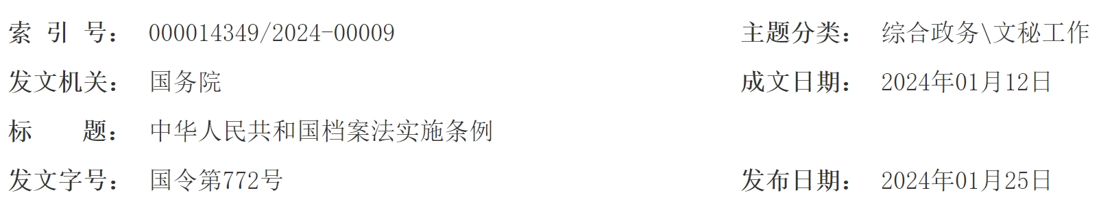 《中华人民共和国档案法实施条例》已经2023年12月29日国务院第22次常务会议通过,现予公布,自2024年3月1日起施行。
