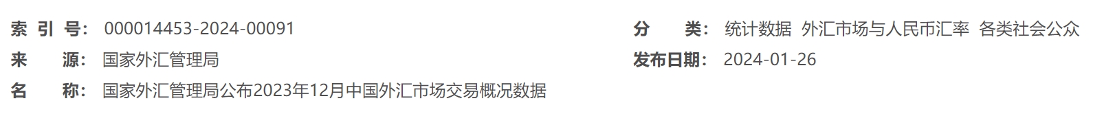 国家外汇管理局公布2023年12月中国外汇市场交易概况数据