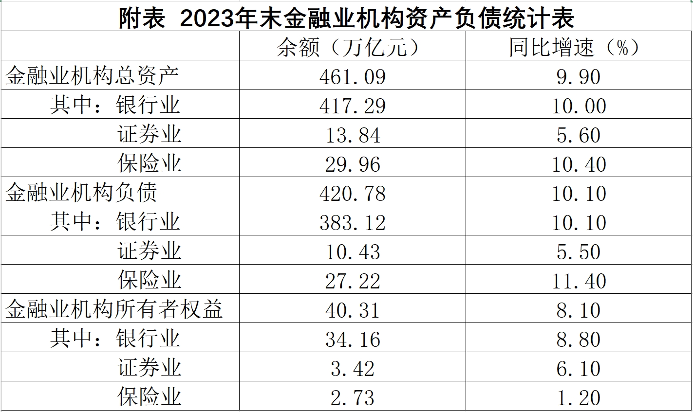 初步统计,2023年末,我国金融业机构总资产为461.09万亿元,同比增长9.9%,其中,银行业机构总资产为417.29万亿元,同比增长10%;证券业机构总资产为13.84万亿元,同比增长5.6%;保险业机构总资产为29.96万亿元,同比增长10.4%。