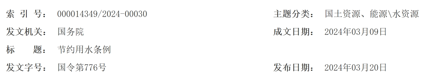 《节约用水条例》已经2024年2月23日国务院第26次常务会议通过,现予公布,自2024年5月1日起施行。
