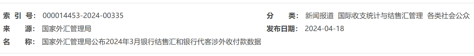 按美元计值,2024年3月,银行结汇1840亿美元,售汇2007亿美元。2024年1-3月,银行累计结汇5422亿美元,累计售汇5670亿美元。