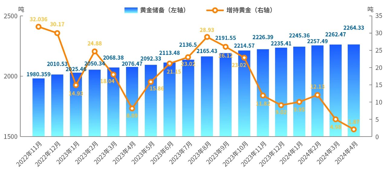 5月7日,中国人民银行官网披露最新数据,4月末黄金储备7280万盎司(约2264.33吨),环比增加6万盎司(约1.87吨),3月末7274万盎司(约2262.47吨)。这是我国连续第18个月增持黄金储备,共增持1016万盎司(约316.01吨)。