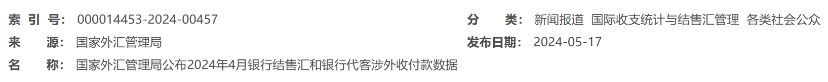 按美元计值,2024年4月,银行结汇1737亿美元,售汇2118亿美元。2024年1-4月,银行累计结汇7159亿美元,累计售汇7788亿美元。