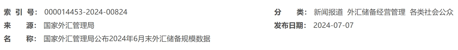 国家外汇管理局公布2024年6月末外汇储备规模数据