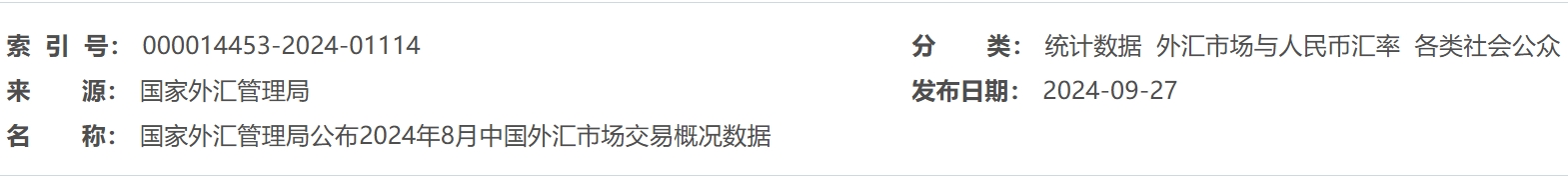 国家外汇管理局公布2024年8月中国外汇市场交易概况数据