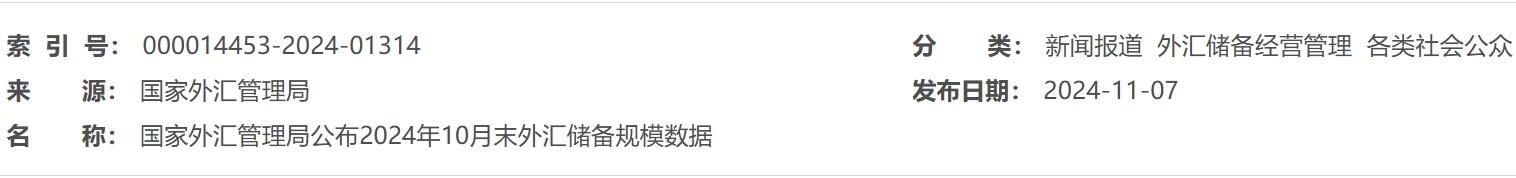 国家外汇管理局公布2024年10月末外汇储备规模数据