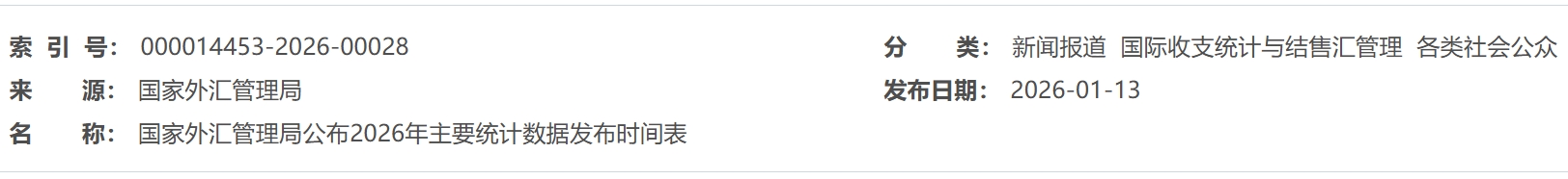 国家外汇管理局公布2026年主要统计数据发布时间表
