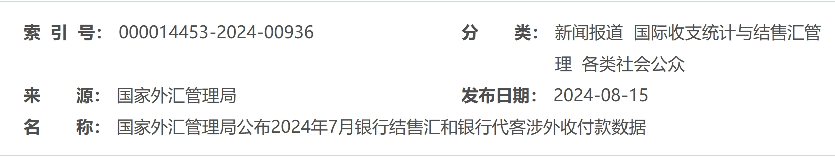 国家外汇管理局公布2024年7月银行结售汇和银行代客涉外收付款数据