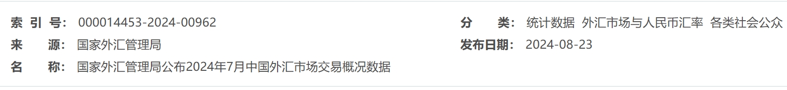 国家外汇管理局公布2024年7月中国外汇市场交易概况数据