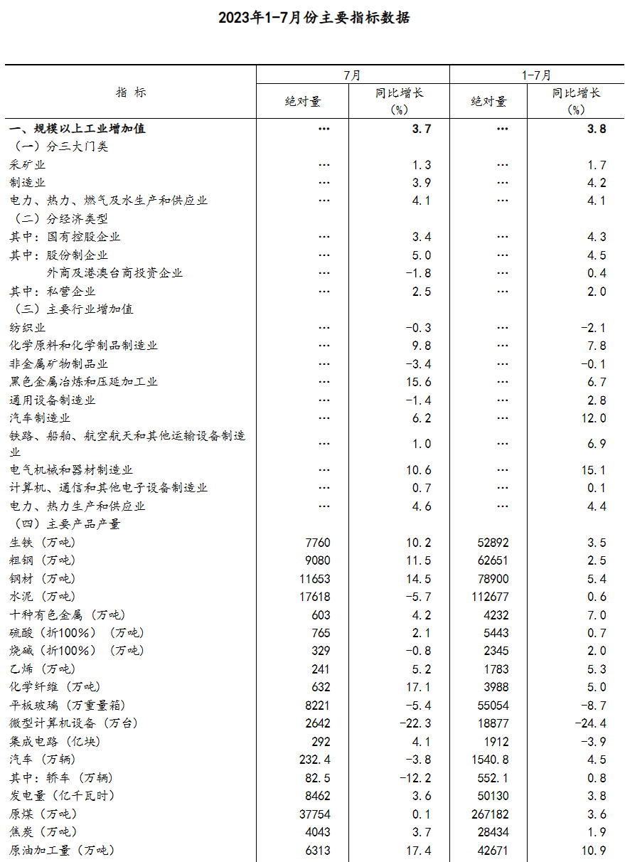 7月份,全国规模以上工业增加值同比增长3.7%,环比增长0.01%。分三大门类看,采矿业增加值同比增长1.3%,制造业增长3.9%,电力、热力、燃气及水生产和供应业增长4.1%。原材料制造业增加值同比增长8.8%,比上月加快2.0个百分点。分经济类型看,国有控股企业增加值同比增长3.4%;股份制企业增长5.0%,外商及港澳台商投资企业下降1.8%;私营企业增长2.5%。分产品看,太阳能电池、新能源汽车产品产量同比分别增长65.1%、24.9%。1-7月份,全国规模以上工业增加值同比增长3.8%。7月份,制造业采购经理指数为49.3%,企业生产经营活动预期指数为55.1%。