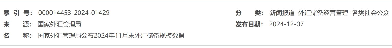 国家外汇管理局公布2024年11月末外汇储备规模数据